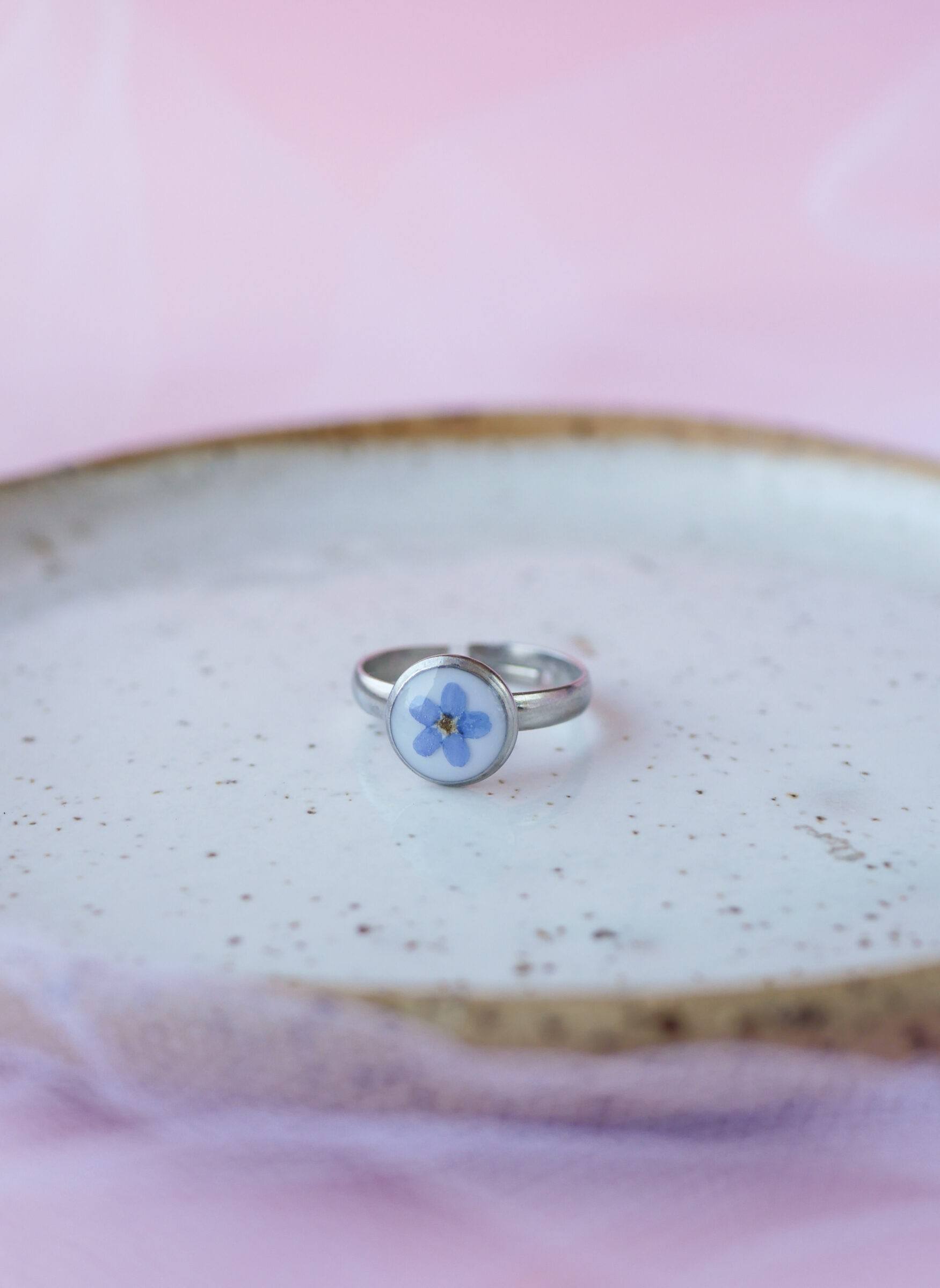 Pierścionek ze stali nierdzewnej w kolorze srebra z niezapominajką na mlecznym tle.