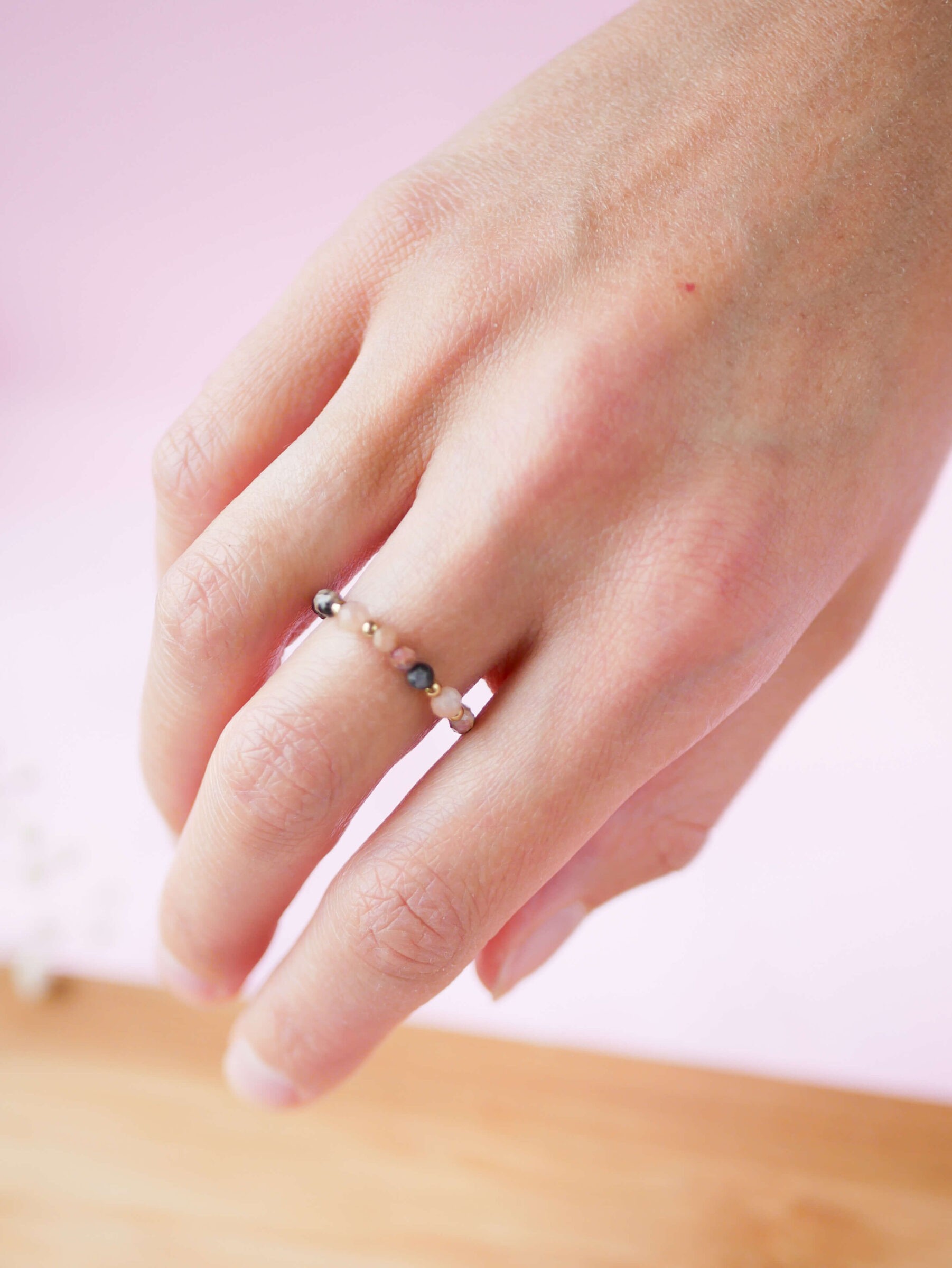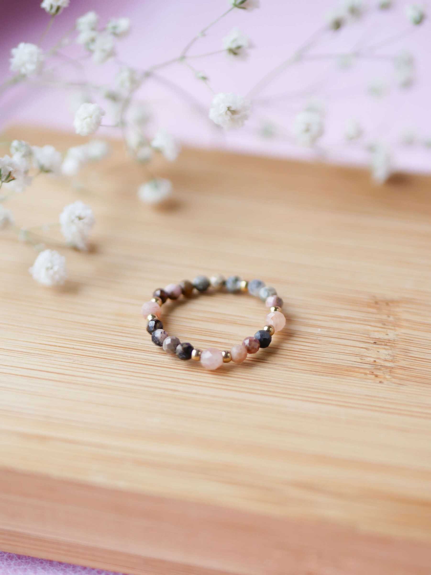 Pierścionek z kamieniami rodonitu i kamieni słonecznych. Na elastycznej gumce z dodatkiem koralików ze stali nierdzewnej w kolorze złota lub srebra.