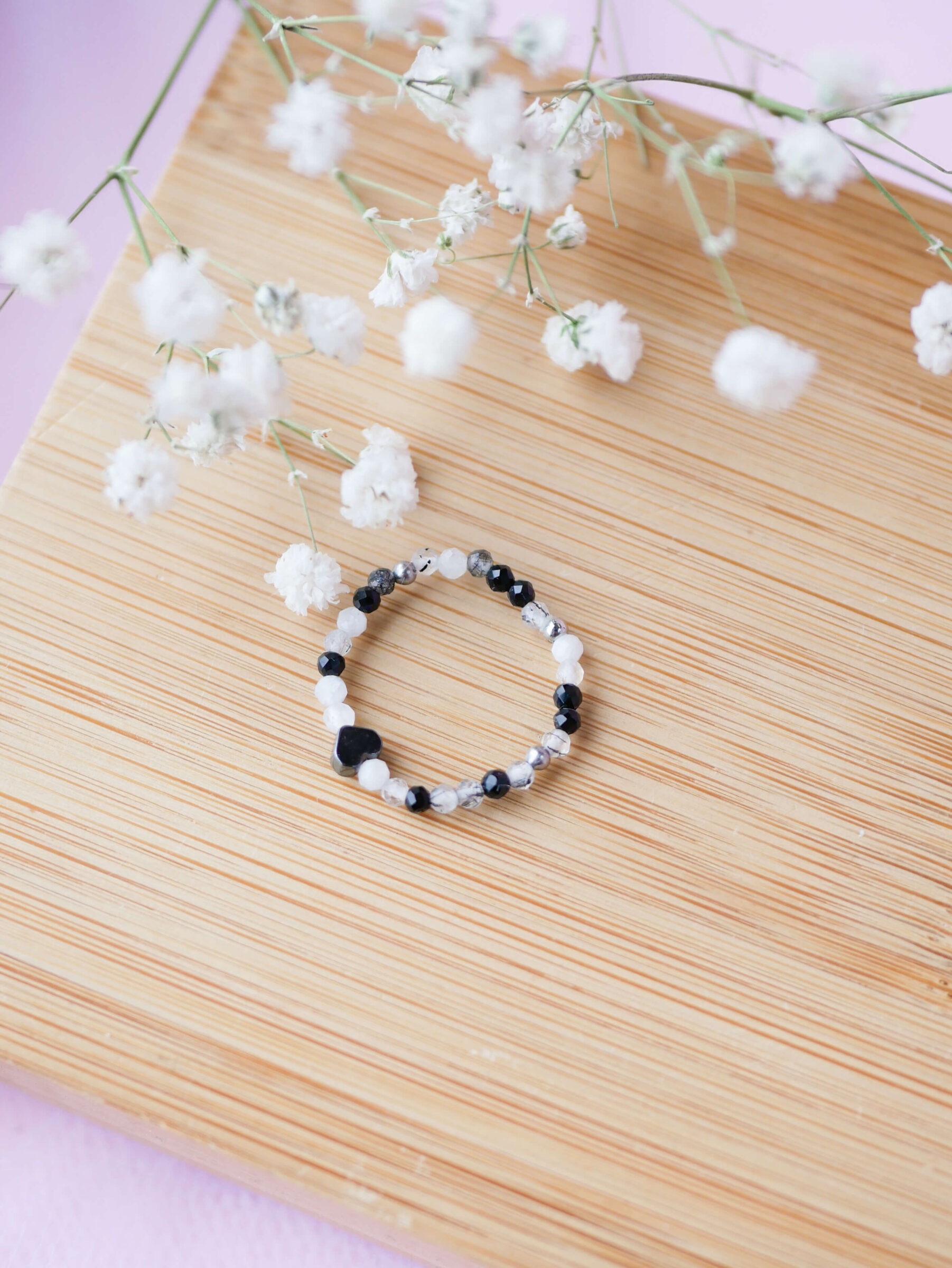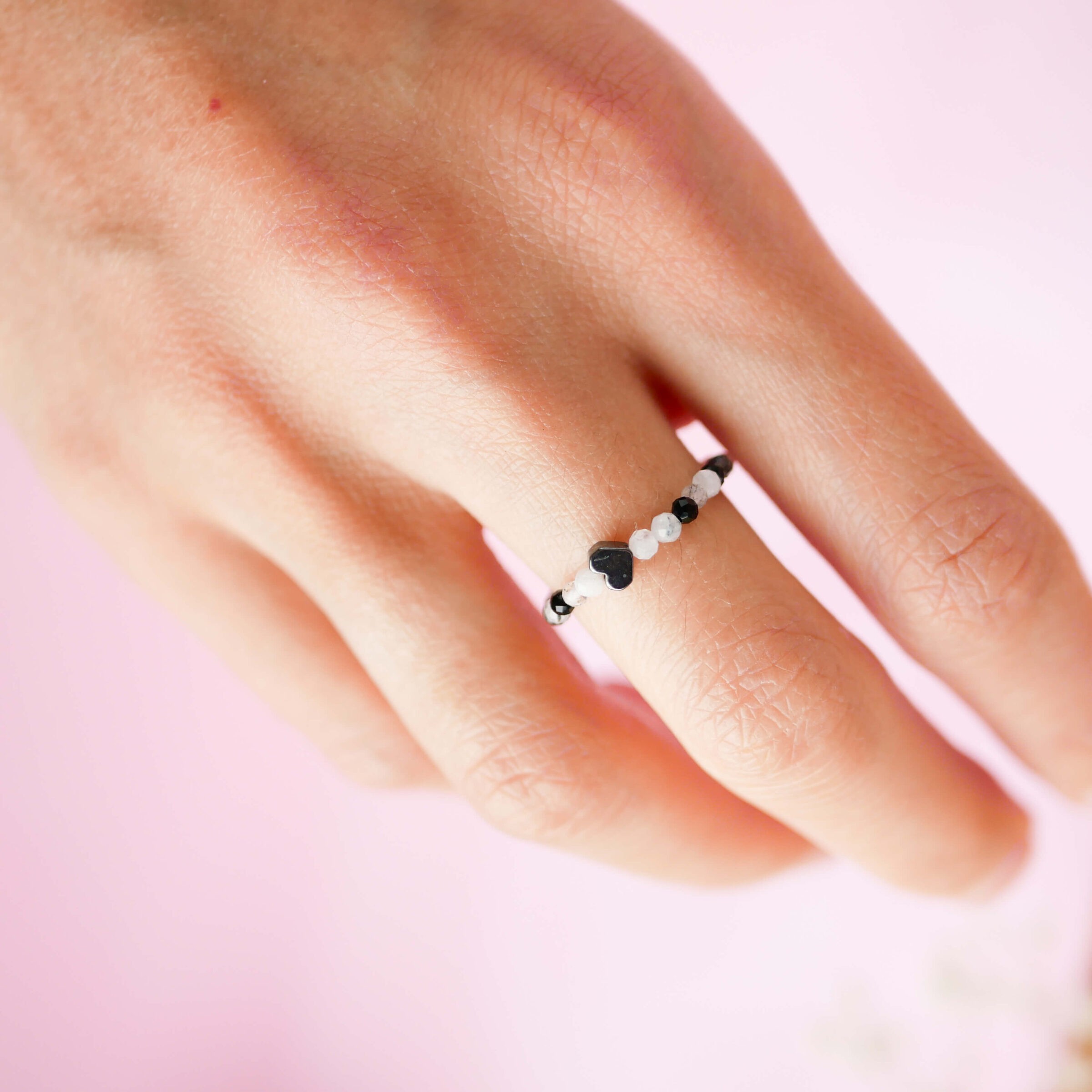 Pierścionek z kamieniami księżycowymi i czarnym turmalinem z sercem z hematytu. Na elastycznej gumce z dodatkiem koralików ze stali nierdzewnej w kolorze złota lub srebra.