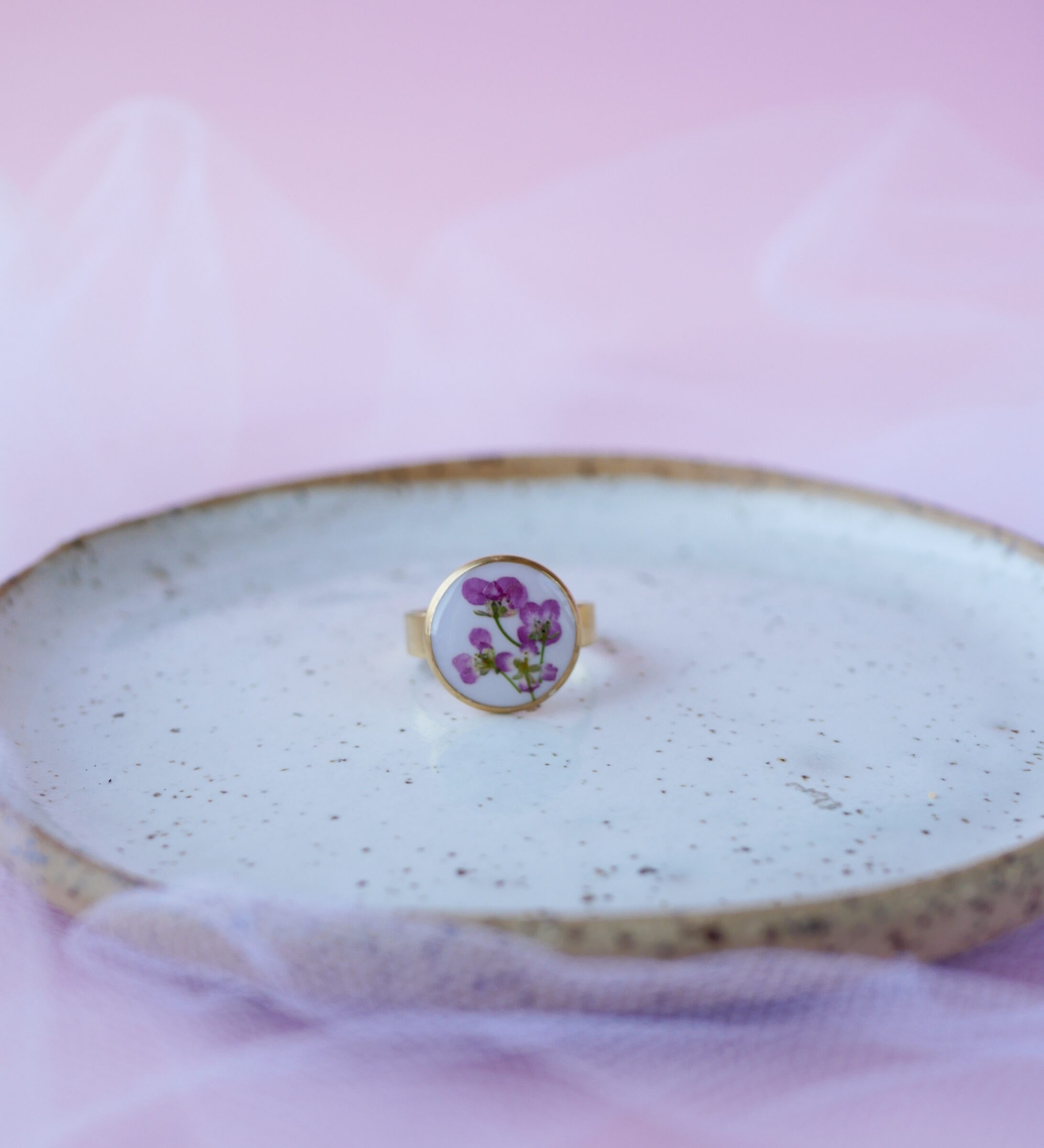 Pierścionek ze stali nierdzewnej w kolorze złota z różową smagliczką na mlecznym tle.