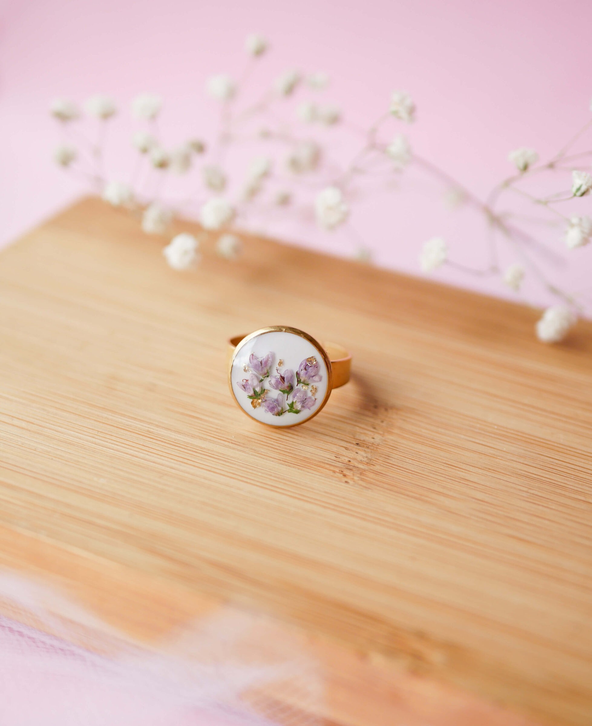 Pierścionek ze stali nierdzewnej w kolorze złota z wrzosami na mlecznym tle.