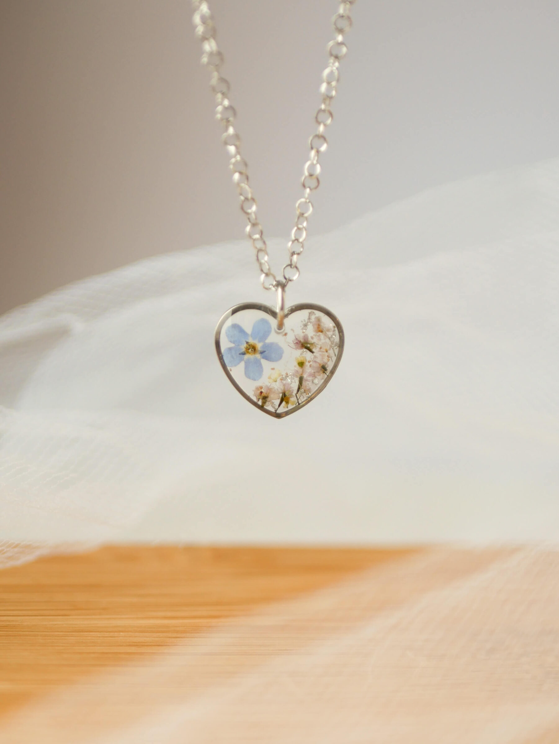 Naszyjnik serce z niezapominajką, dziką marchwią z drobinkami srebra na przeźroczystym tle. Baza ze stali nierdzewnej w kolorze srebra.