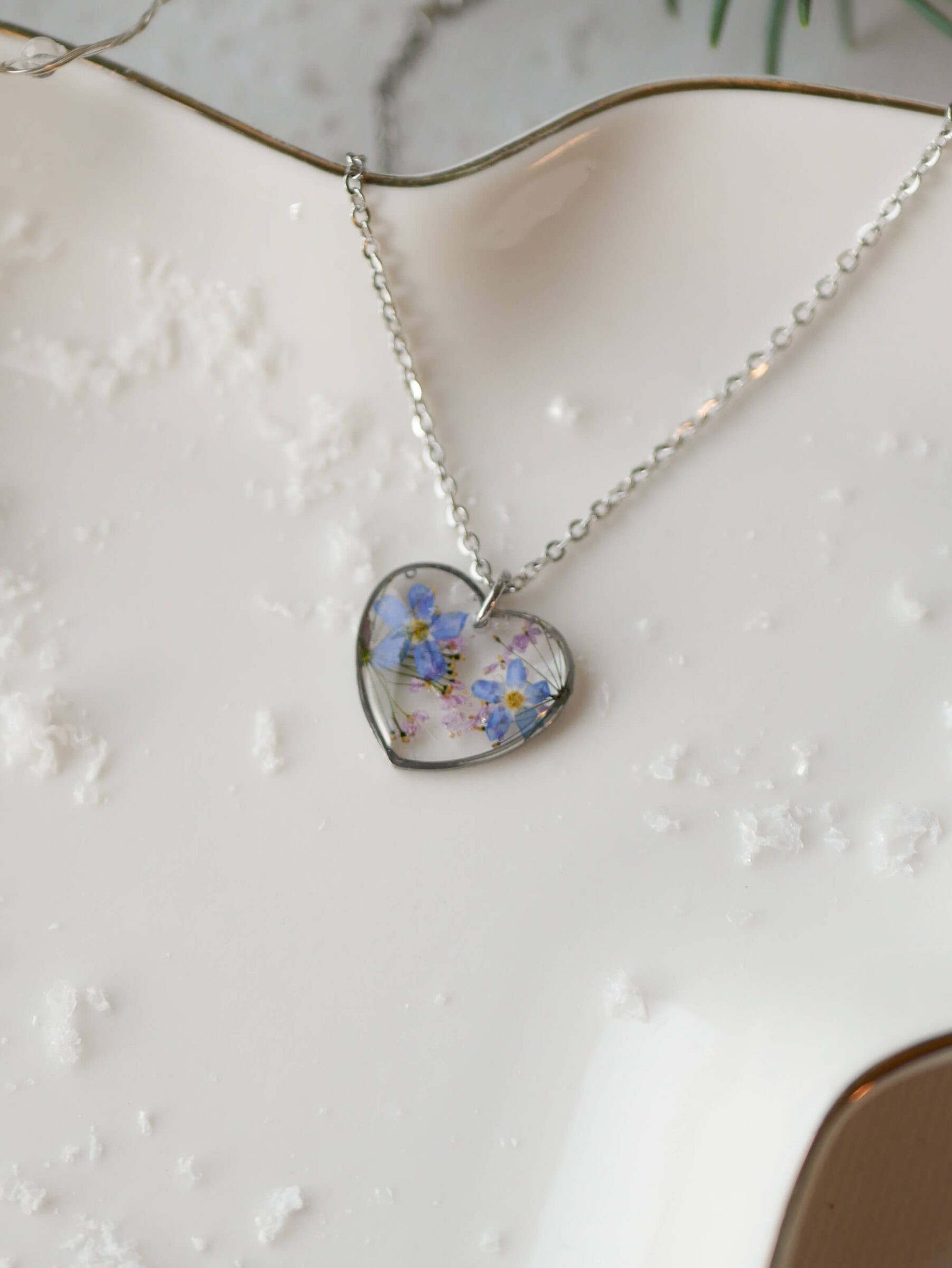 Naszyjnik serce z niezapominajką i dziką marchwią przeźroczystym tle. Baza ze stali nierdzewnej w kolorze srebra.