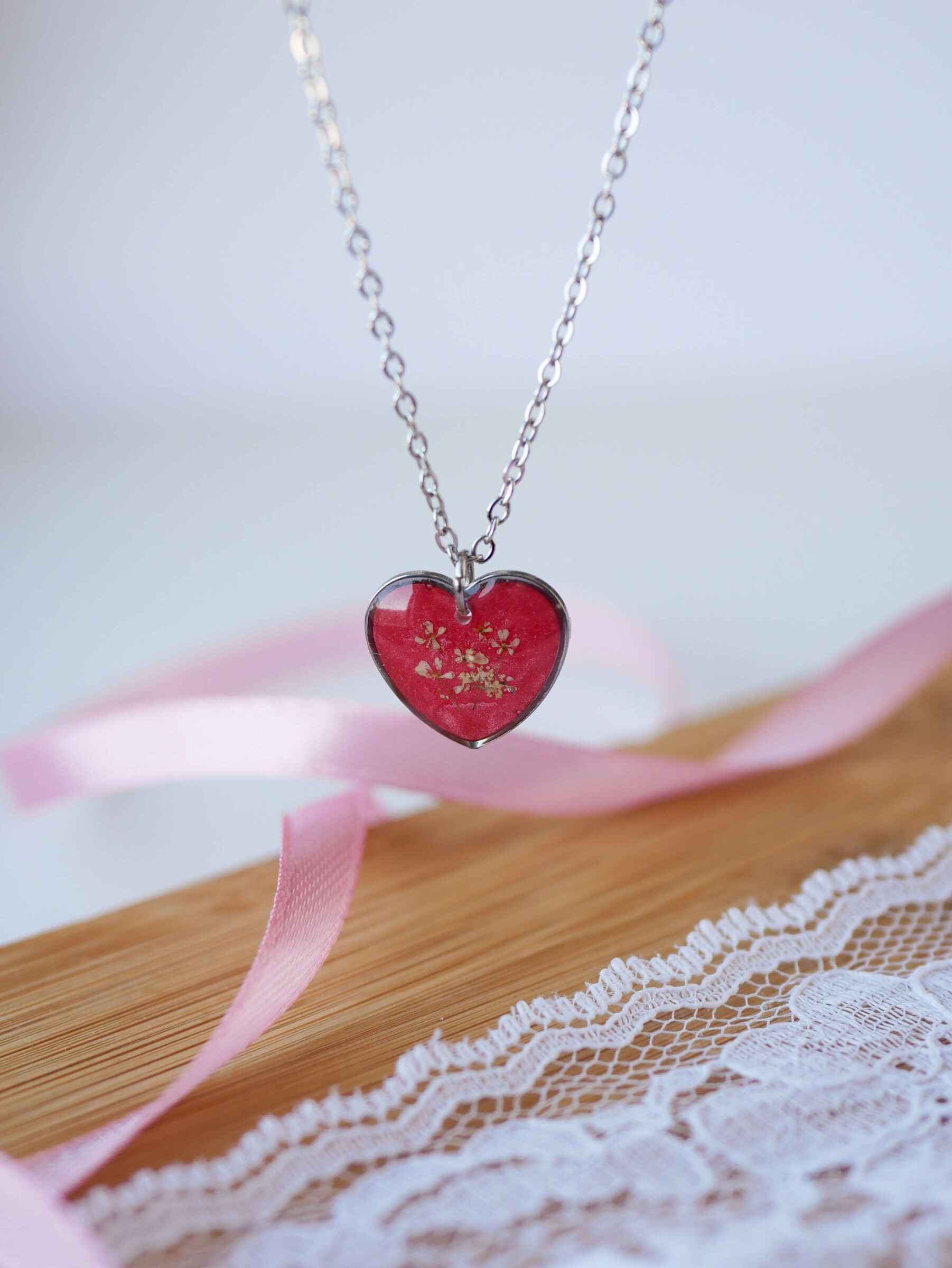 Naszyjnik serce z dziką marchwią na czerwonym tle z perłową poświatą. Baza ze stali nierdzewnej w kolorze srebra.