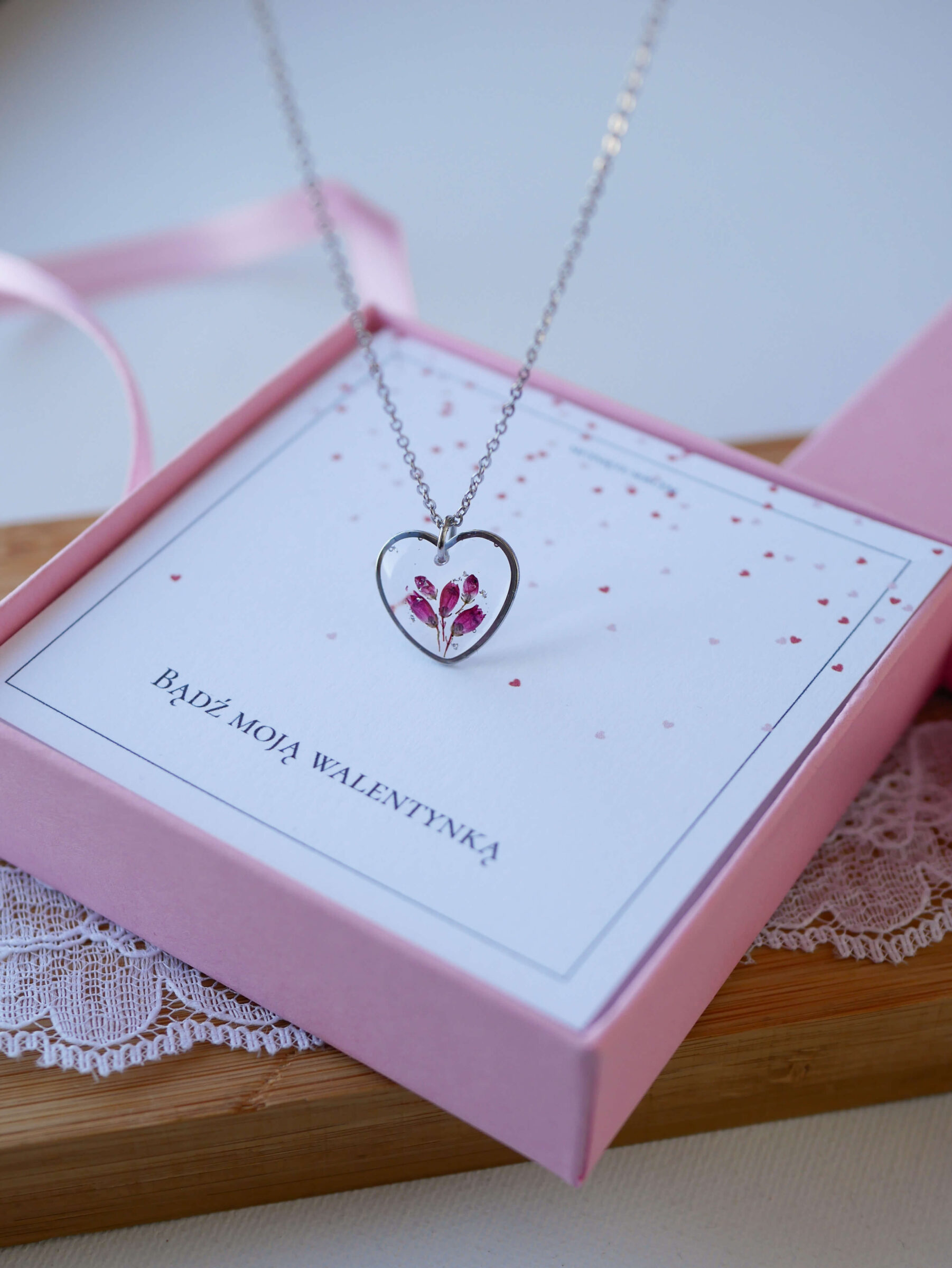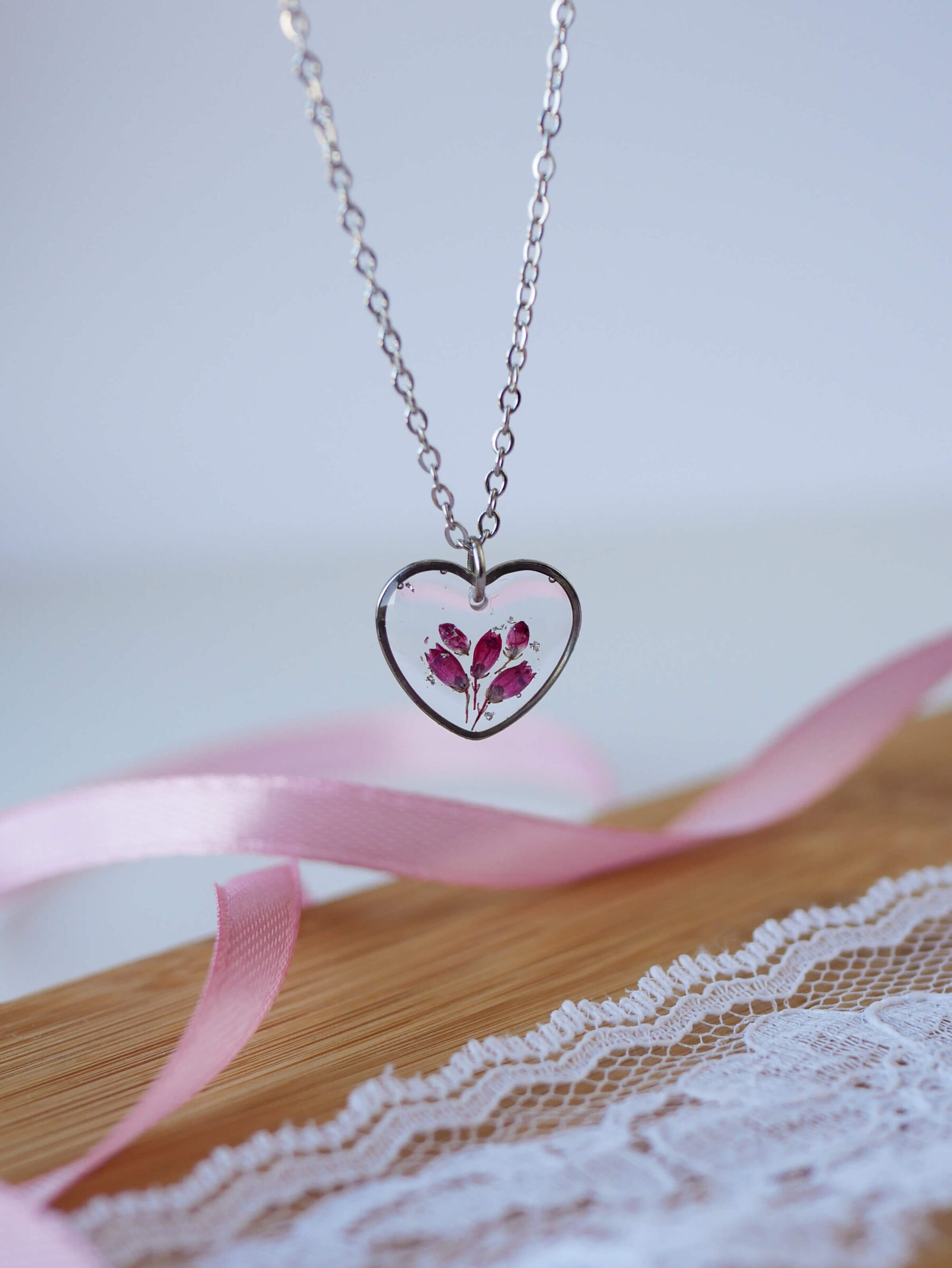 Naszyjnik serce z wrzoścem z drobinkami srebra na  przeźroczystym tle. Baza ze stali nierdzewnej w kolorze srebra.