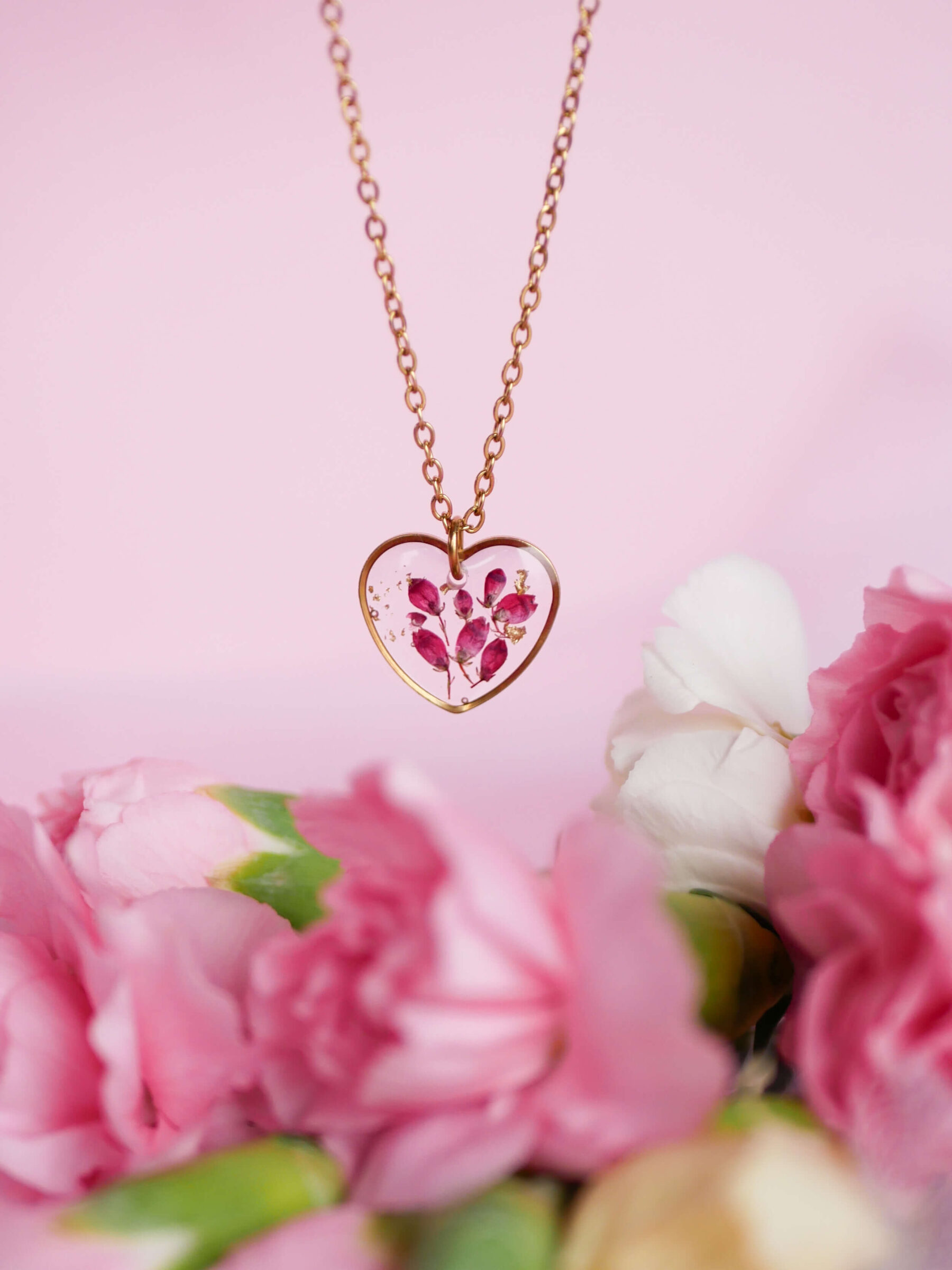 Naszyjnik serce z kwiatami wrzośca z drobinkami złota na przeźroczystym tle. Baza ze stali nierdzewnej w kolorze złota.