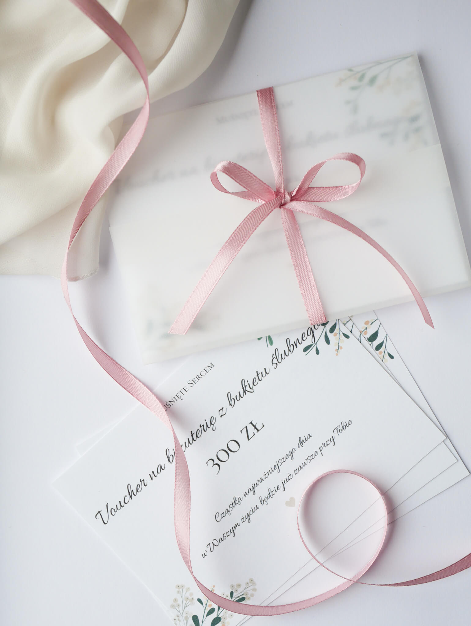 Voucher na biżuterię z bukietu ślubnego na kwotę 300 zł.