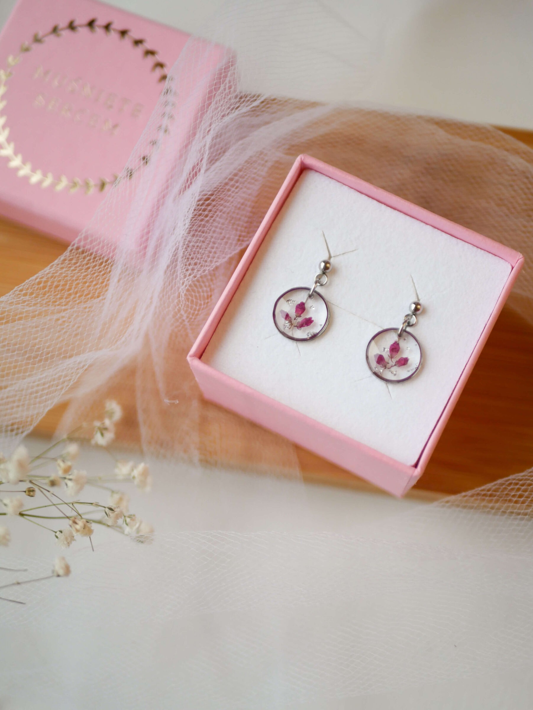 Wiszące kolczyki kółeczka z wrzoścem i drobinkami srebra na przezroczystym tle.