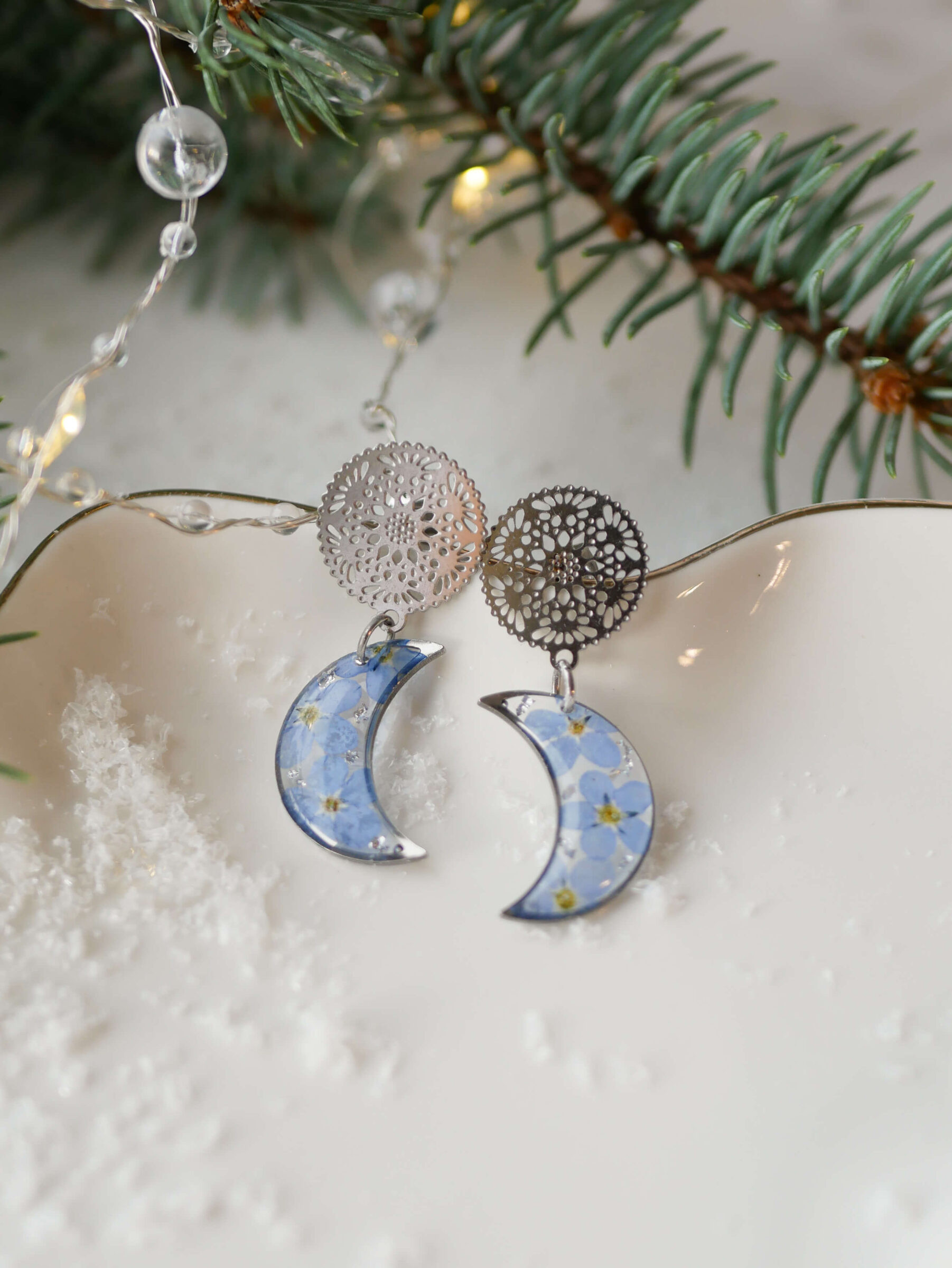 Wiszące kolczyki księżyce z mandalą i niezapominajkami na przezroczystym tle.