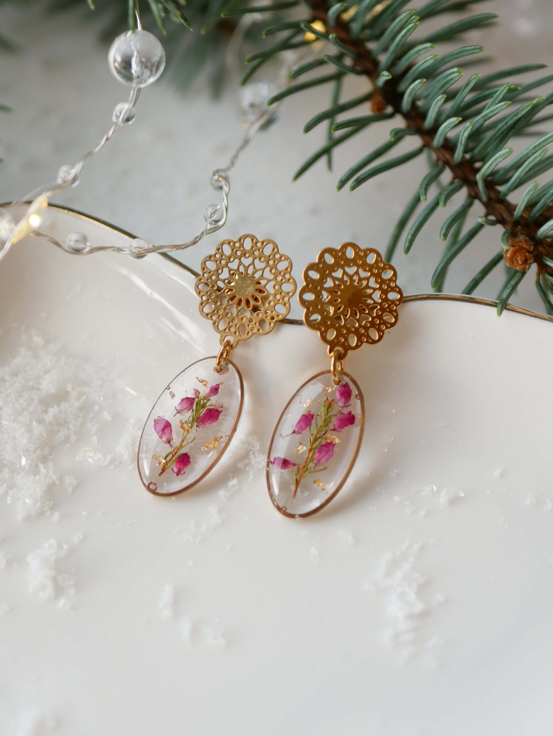 Wiszące kolczyki owale z mandalą i wrzoścem na przezroczystym tle z drobinkami złota.