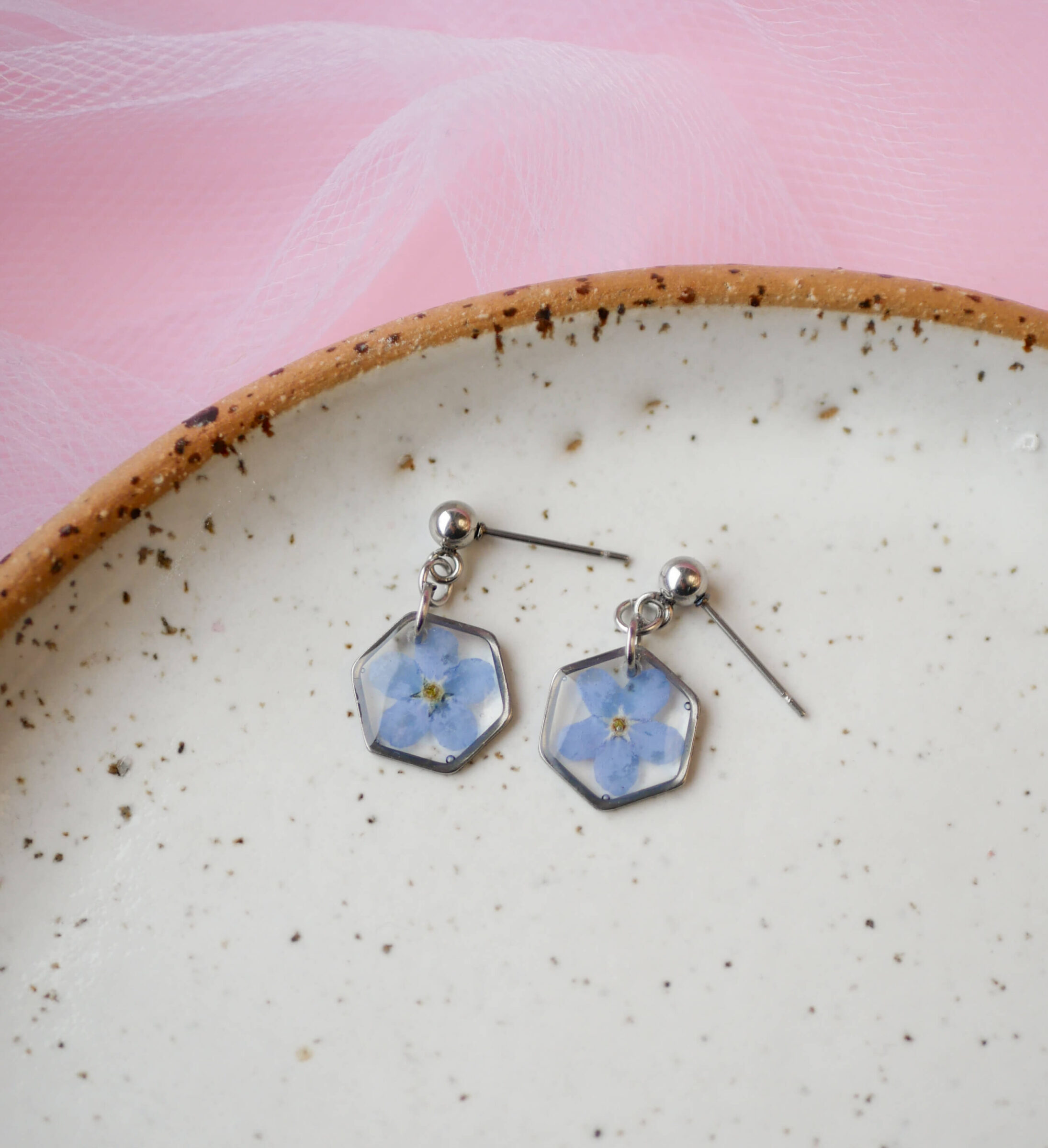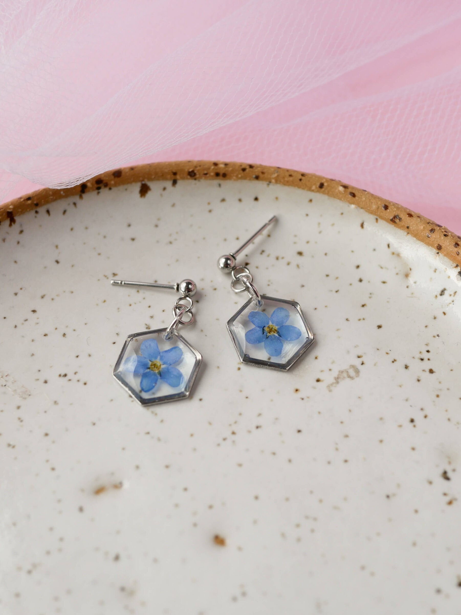 Wiszące kolczyki & niezapominajki w heksagonie