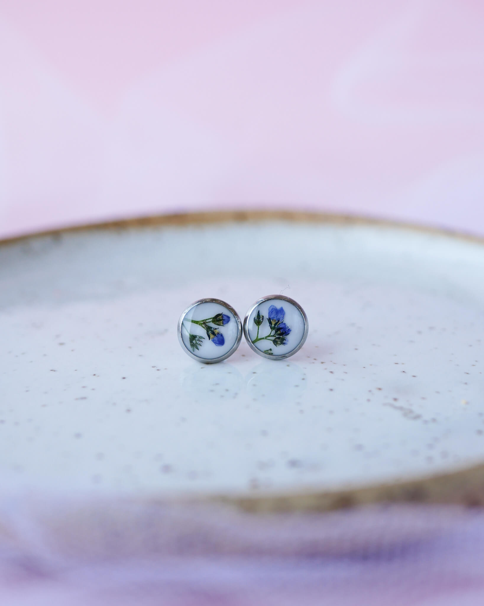 Kolczyki wkrętki z gałązkami niezapominajek na mlecznym tle.