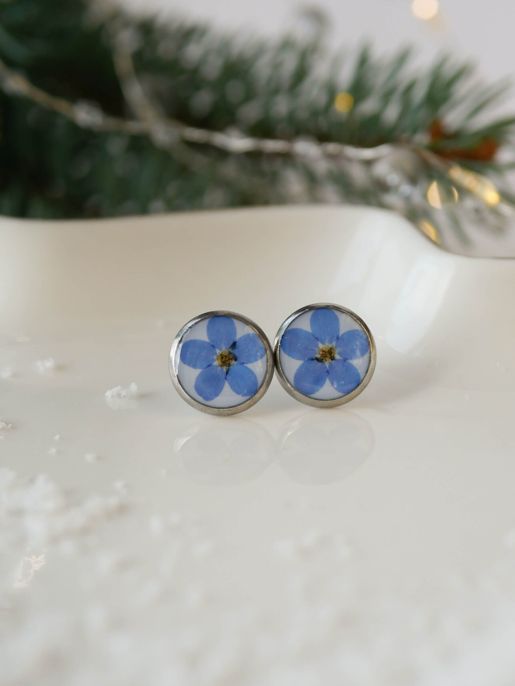 NoKolczyki wkrętki z niezapominajkami na mlecznym tle.