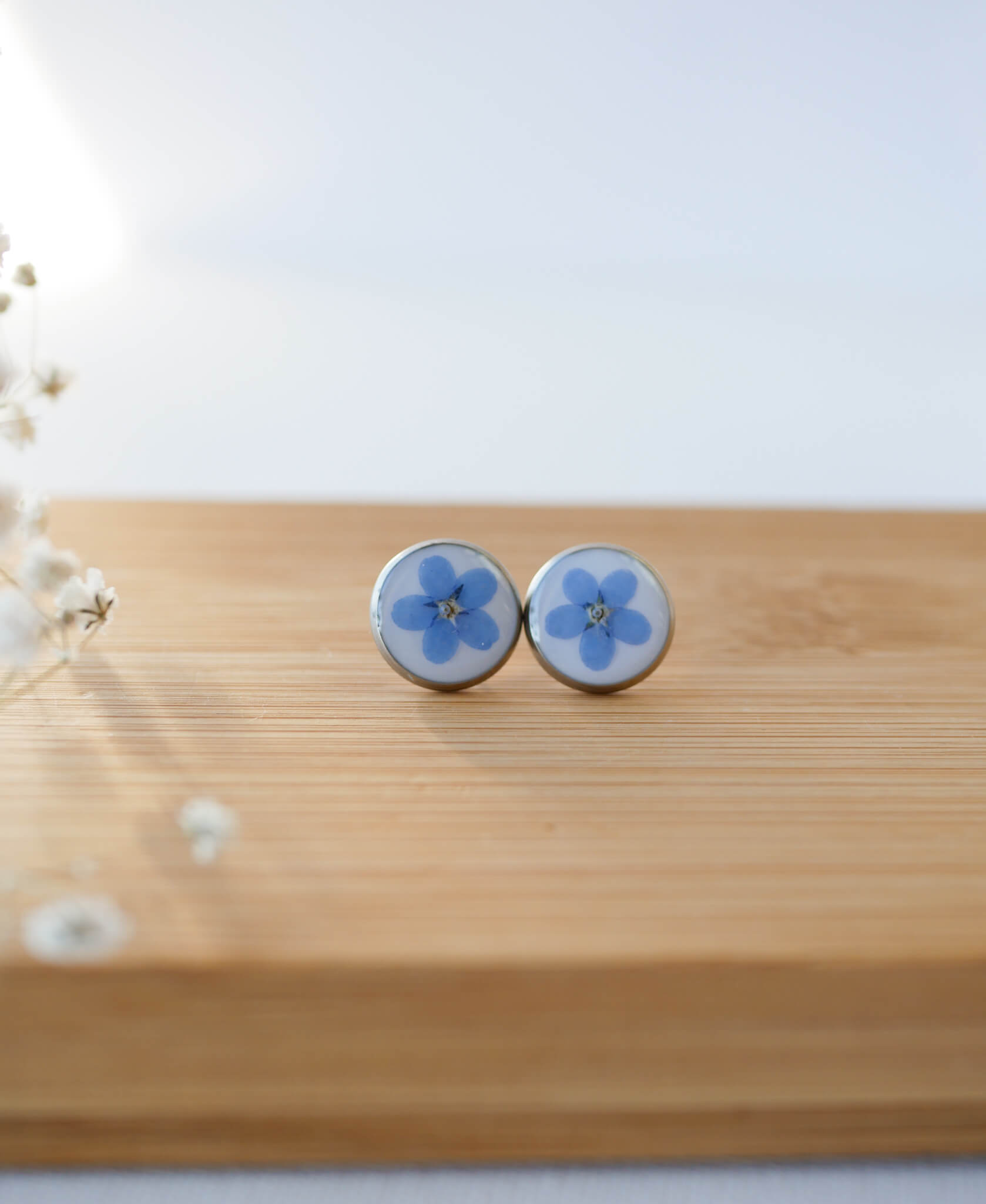 Kolczyki wkrętki z niezapominajkami na mlecznym tle.