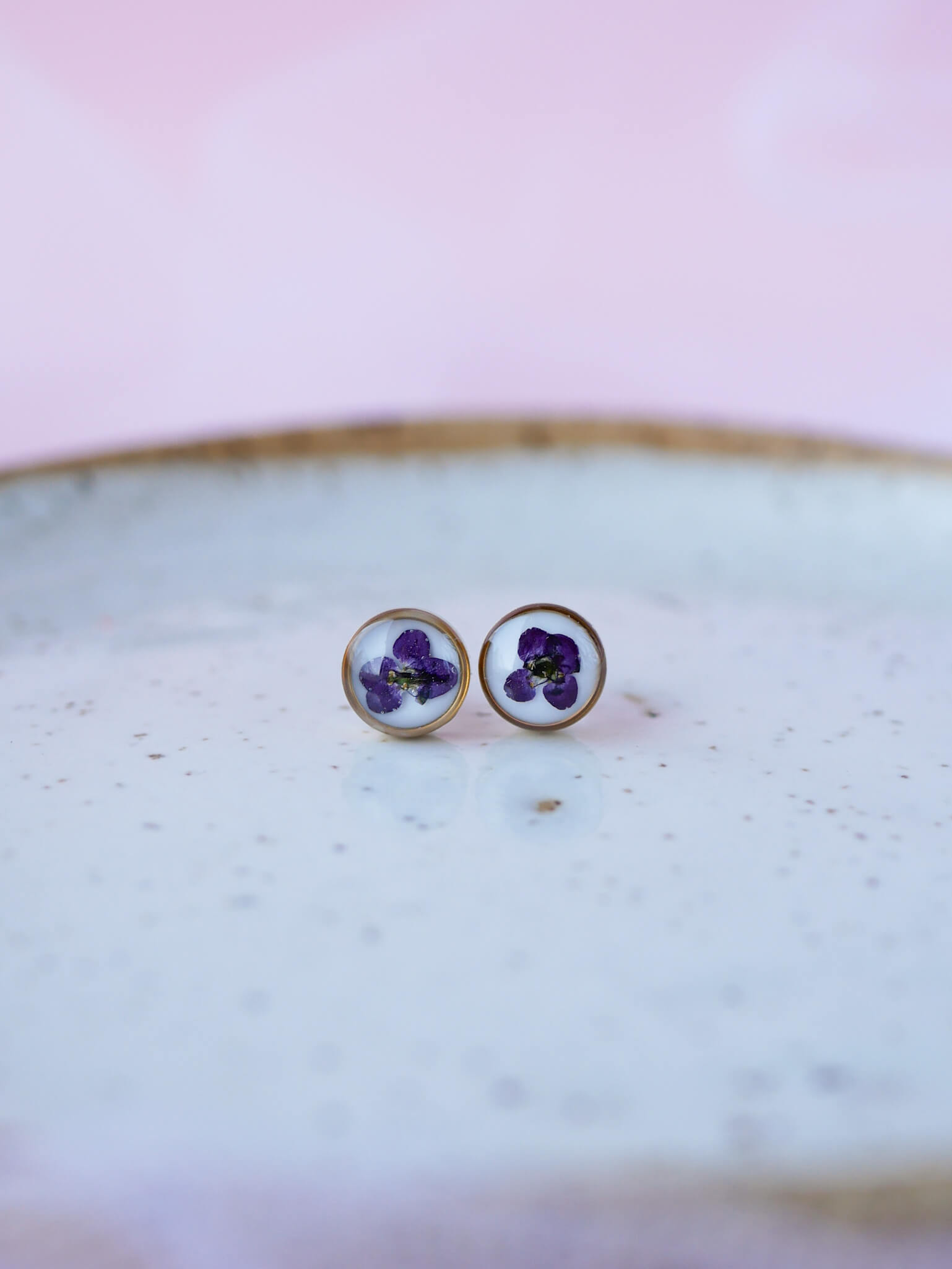 Kolczyki wkrętki  z fioletowymi smagliczkami na mlecznym tle.