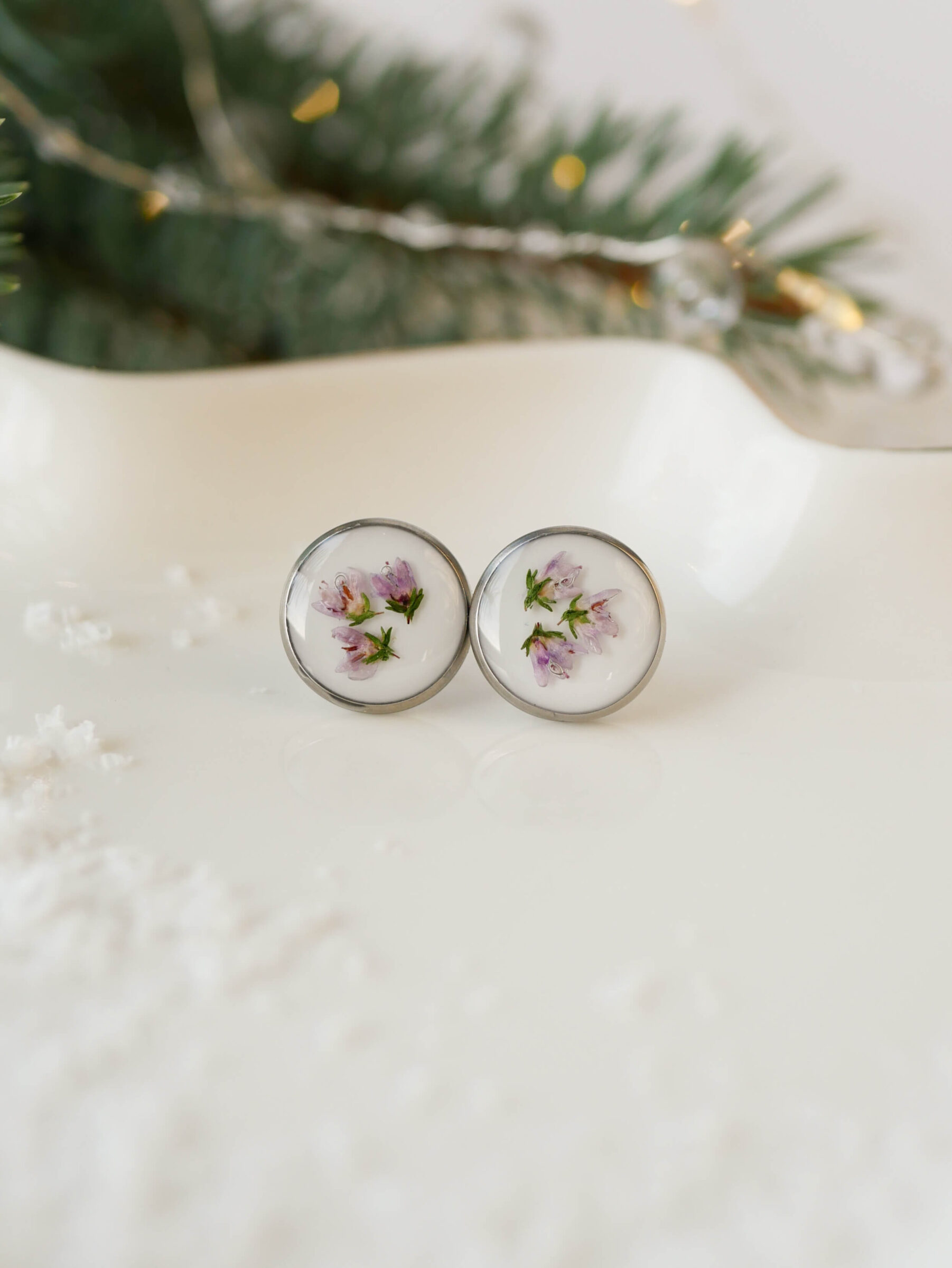 Kolczyki wkrętki z gorczańskim wrzosem na mlecznym tle.