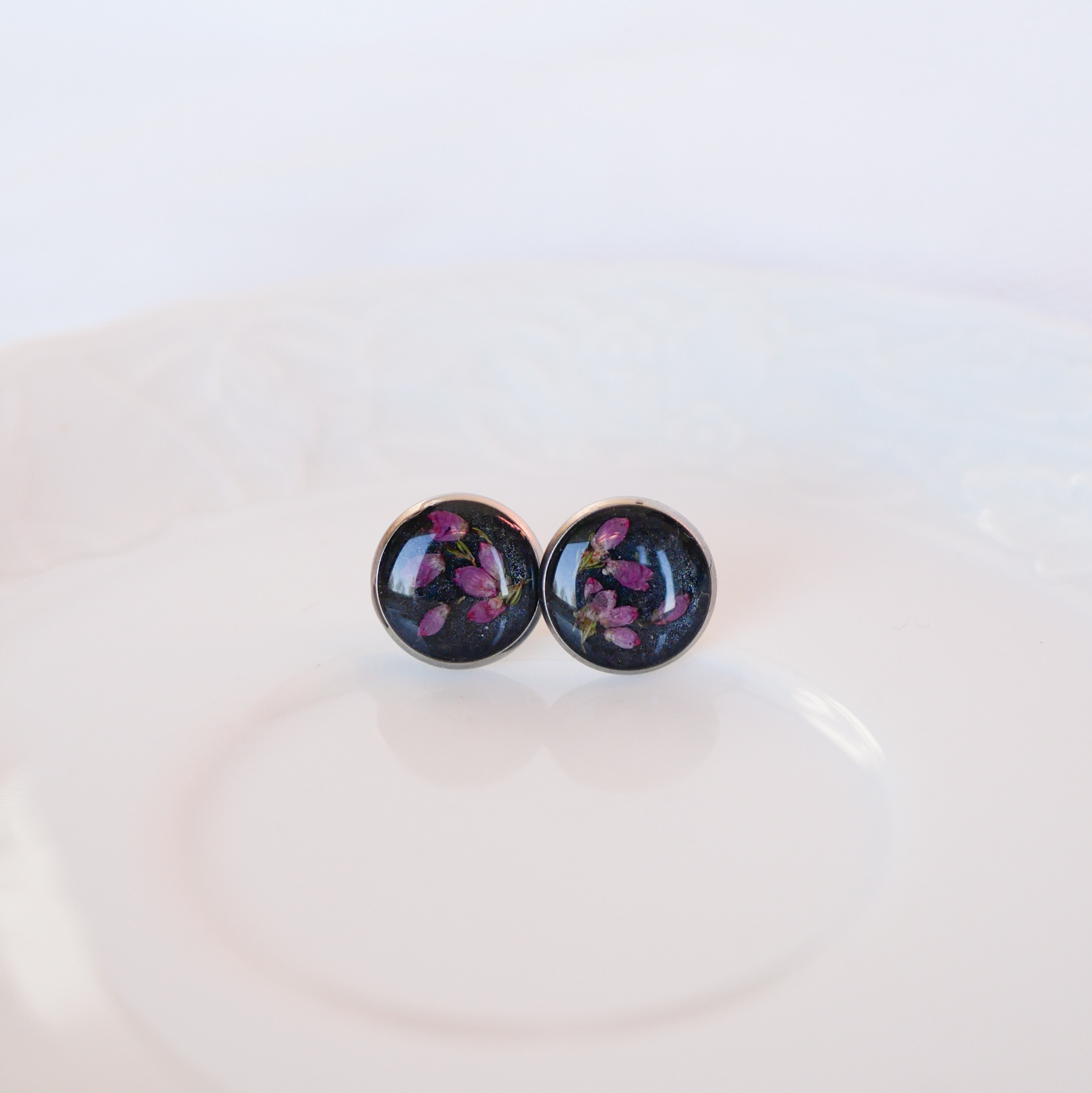 Kolczyki wkrętki z wrzoścem na ciemnym tle z perłową poświatą.
