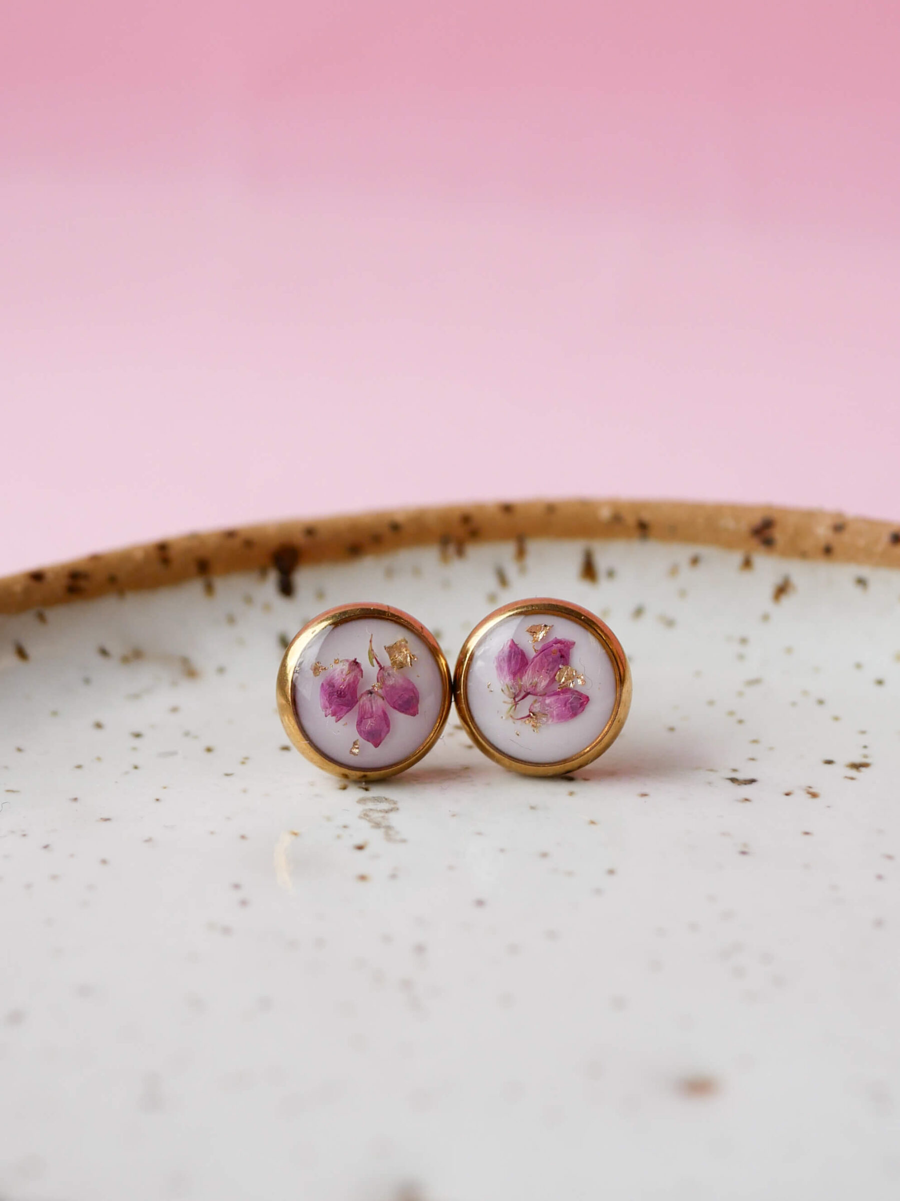 Kolczyki wkrętki  z wrzoścem na mlecznym tle z drobinkami złota.